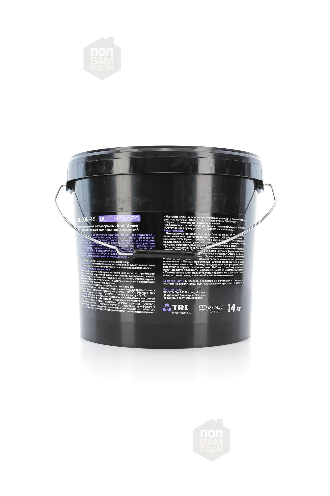 TRICOL PRO 1K PT-MS HARD - Премиальный однокомпонентный высокопрочный (HARD) клей для всех видов деревянных напольных покрытий. Клей произведен на основе силан-модифицированного полимера и применяется для укладки любых видов паркета, паркетной и инженерной доски (штучного, мозаичного, многослойного и т.д.) и массивной доски любых размеров из любой породы древесины на различные виды впитывающих и невпитывающих оснований. Идеален для штучного паркета и экзотических пород древесины. Клей соответствует DIN EN ISO 17178, категория HARD. В разработке клея были использованы самые современные разработки в области клеевых систем, а также оборудование и опыт ведущих мировых производителей.