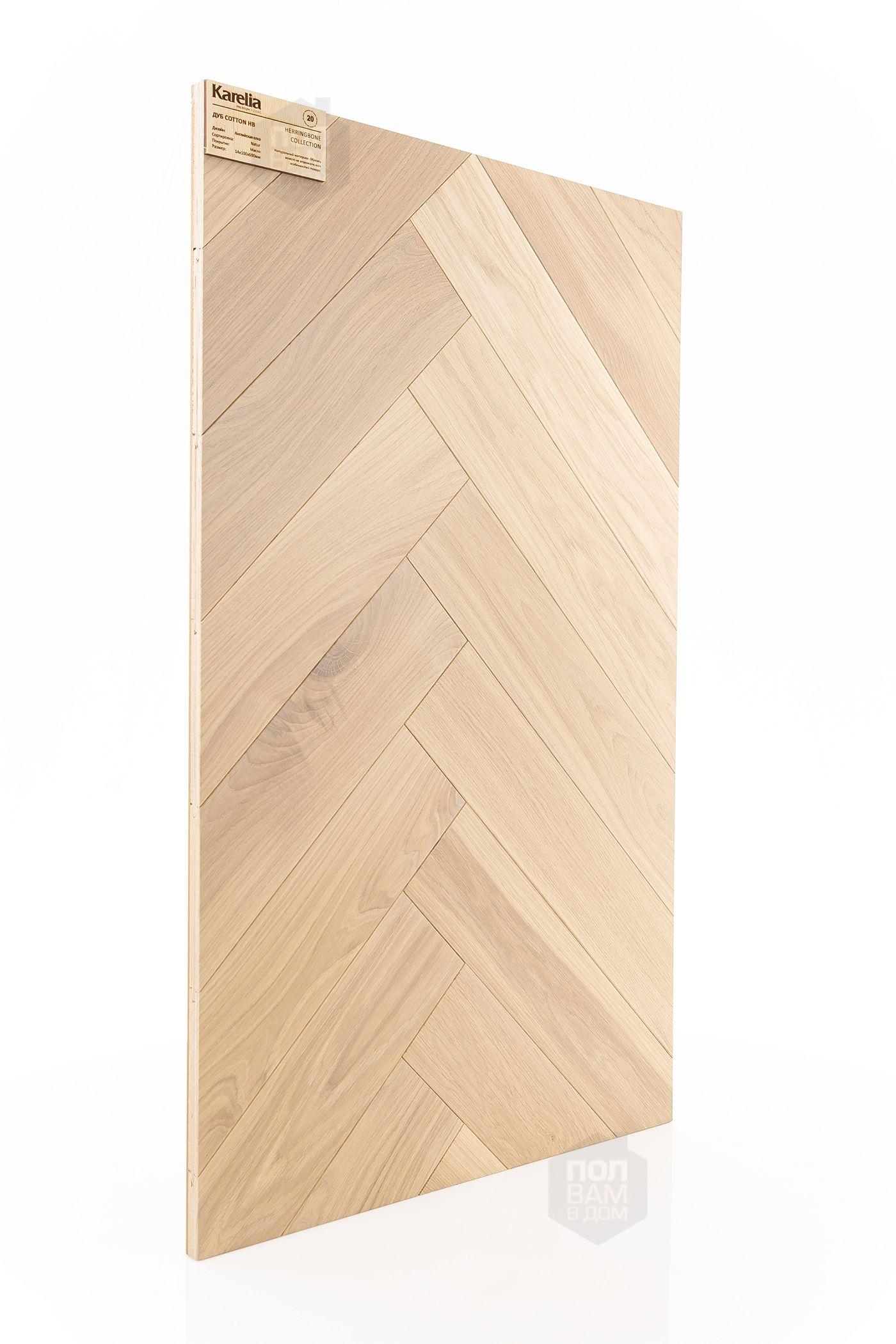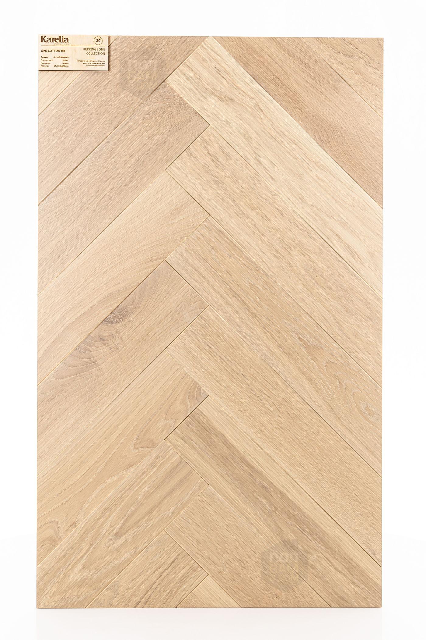 Инженерная доска Karelia Дуб Cotton HB - цена 7 900 руб. за квадратный метр. Это покрытие толщиной 14 мм, порода дерева - дуб, сортировка - натур, фаска с 4-х сторон. Брашированная поверхность инженерной доски имеет светлый оттенок и матовый блеск. Для того, чтобы купить в Санкт-Петербурге инженерную доску из коллекции Karelia Herringbone Дуб Cotton HB, положите товар в корзину или свяжитесь с нами любым доступным способом. Товар есть в наличии.