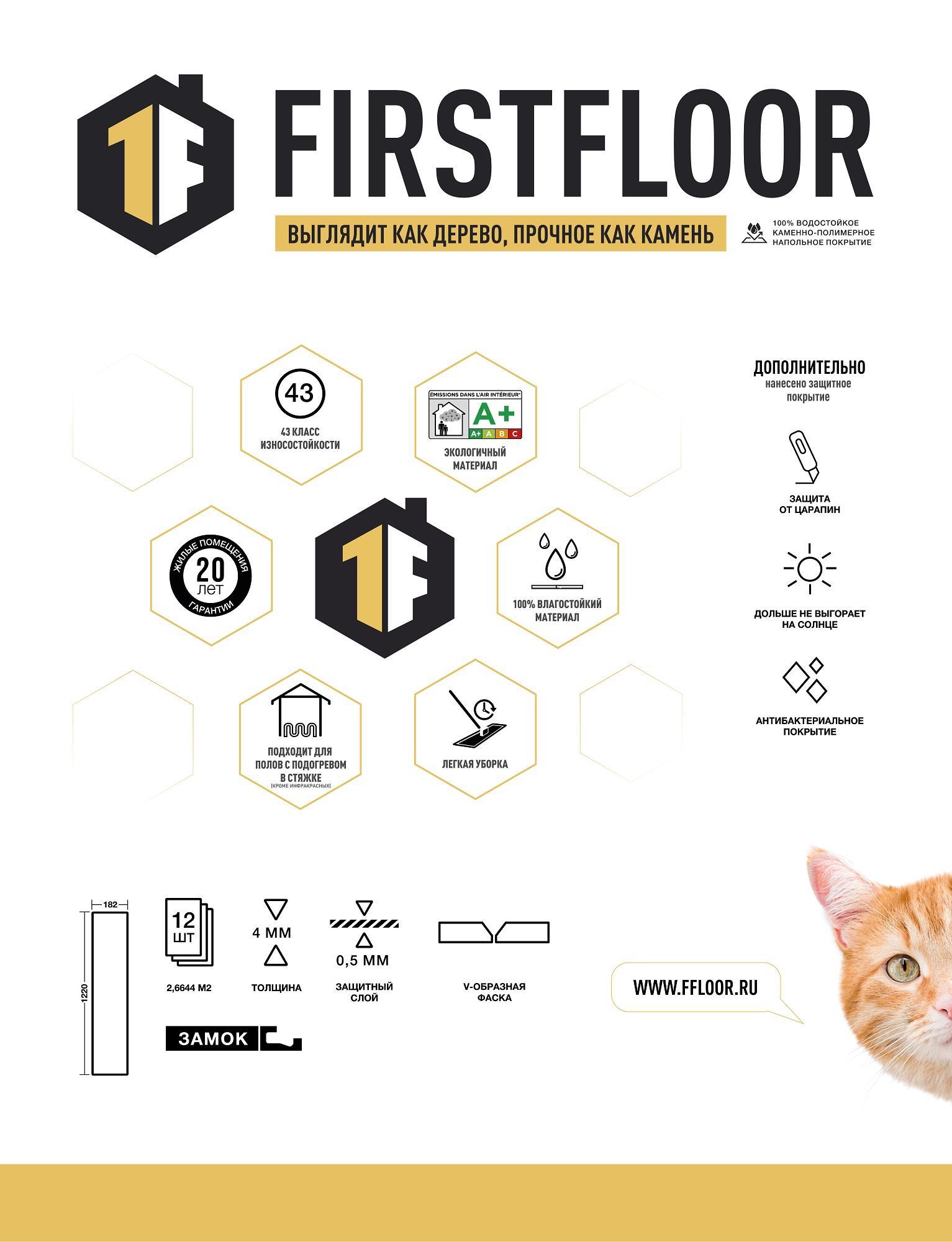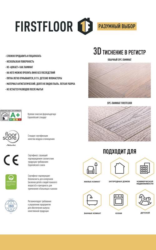 SPC ламинат FirstFloor — разрабатывался специально для стран Европы и Америки и имеет большую популярность на этих континентах. Более 20 лет насчитывает история его успешных продаж и эксплуатации. Ежегодно производится и продается более 100 000 000 квадратных метров. Теперь этот продукт можно приобрести и у нас. Идеальное сочетание характеристик, пользовательских качеств и одновременно элегантности в совокупности с ценой, делают наш SPC ламинат максимально привлекательным к покупке. Его поверхность словно дерево, а устойчивость к нагрузкам — как у камня. С классом износостойкости 43, он способен противостоять даже самым интенсивным воздействиям. его можно использовать во всех бытовых помещениях без исключения. Гарантия на 20 лет подчеркивает наше доверие в надежность и качество этого покрытия.